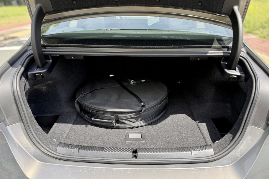 You get four-zone climate control, a Harman Kardon surround sound system that sounds like a dream, electric rear sunshades, and high-grade materials throughout the cabin. It’s a space designed to pamper, and it mostly succeeds. Rear-seat passengers get solid legroom and thoughtful amenities, while the trunk offers 490 liters of usable cargo space – easily accessible despite the presence of a space-saver spare.