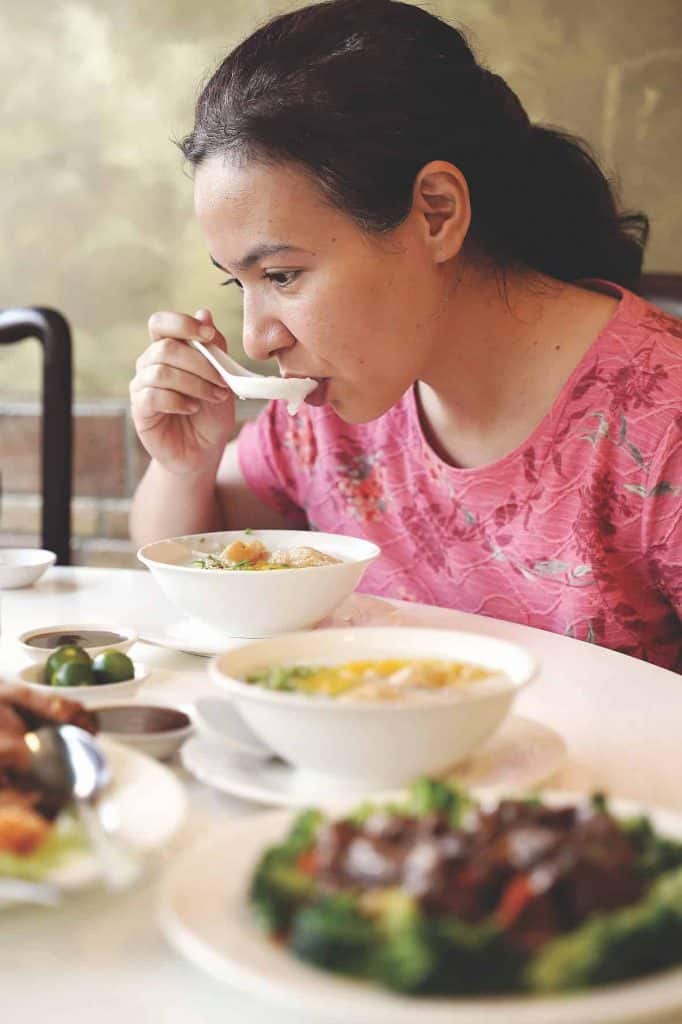 I’ve never really been a “breakfast food” kind of person – so I did not hold back and went straight to ordering a proper heavy meal. I had a quarter of their roast suckling pig, beef with broccoli flower, hakao (steamed shrimp dumplings), one order of their special seafood congee (which was enough to be split into two, for sharing), and their house tea. Everything tasted great. The congee was flavorful and the restaurant did not scrimp on seafood ingredients which included fish and shrimp; the beef was tender and the vegetable crisp. The hakao was cooked right with juicy shrimp and no extenders; and one can never, ever go wrong with juicy, suckling pig! Well, not unless you are trying to watch your cholesterol.