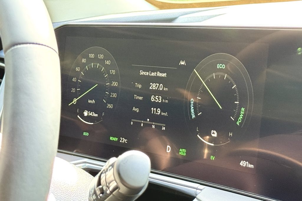 EV mode is present, but a bit of a wallflower. It rarely engages on its own and is mostly limited to crawling speeds. Fuel efficiency over 300 kilometers of driving averaged out at 11.9 km/L – not record-breaking, but understandable given the route and load.