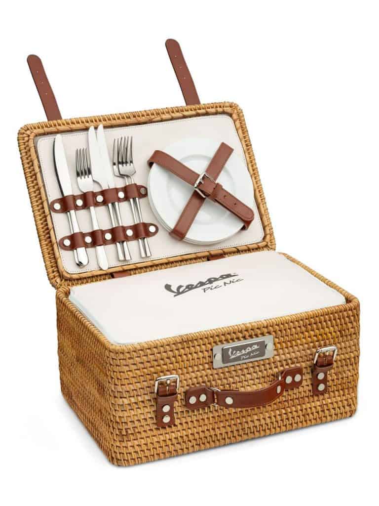 Riders can upgrade their experiences with the Vespa merchandises inspired by Vespa Pic Nic. The picnic blanket,enriched by the embossed Vespa Pic Nic logo, and the special rattan basket (with fixing kit which allows basket to located firmly on the rear rack)with leather details create the vintage vibe of a classic stylish picnic. The picnic kit is completed by the white cooling bag (inside the basket) where food and drinks can be stored once the journey outdoor begins.