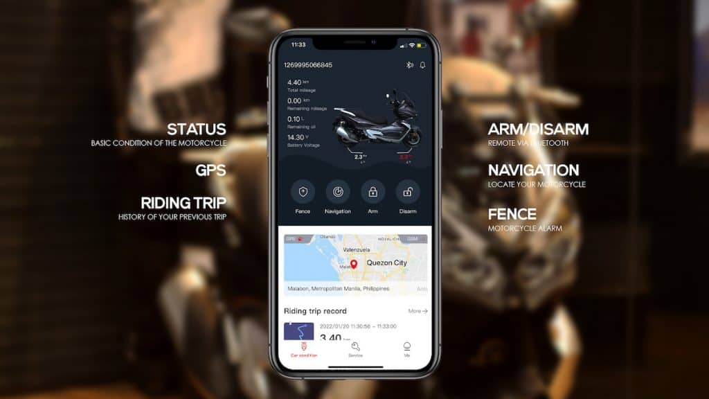 In terms of tech, the Maxie 400 has a TFT display for its instrument, while smartphone charging is possible with its USB port. The display has a tire pressure monitoring system and voltmeter for the battery. It also comes standard with front and rear dashcams, while the ignition is keyless. What makes it even high-tech is the availability of a mobile app that allows users to monitor the bike’s status (basic condition), navigation, and trip meter. Owners can also arm or disarm the Maxie 400 via the app or even activate its alarm remotely.