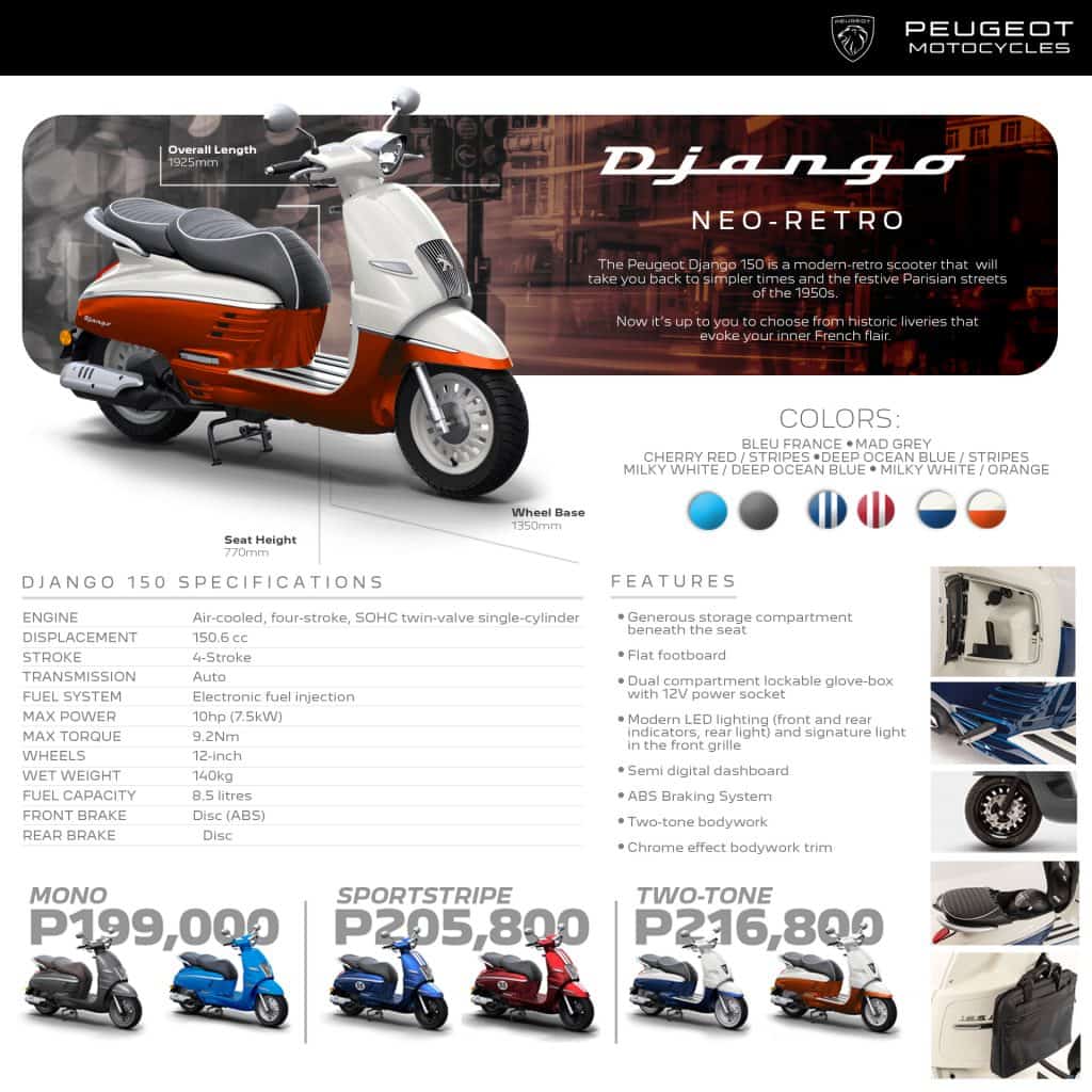 As mentioned, the Peugeot Django 150 comes in three finishes with varying prices. The Mono variant, available in Bleu France and Mad Grey, sells for P199,000. The Sportstripe version, available in Cherry Red and Deep Ocean Blue, has a sticker price of P205,800. The top-spec Two-Tone trim that comes in either Deep Ocean Blue or Orange, both in tandem with Milky White, has an SRP of P216,800.