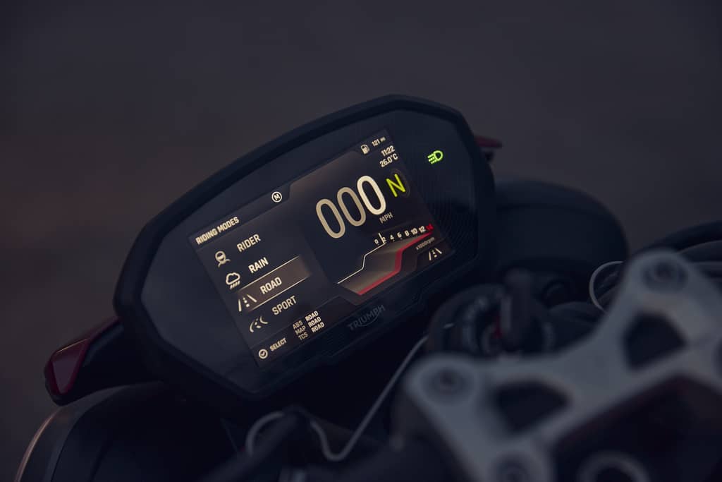 The RS’s outstanding performance and top-end power have been taken to the next level, with all three models benefiting from the same usable torque low down in the rev-range and all the way through the mid-range, with a notable increase from 7,500rpm onwards. The gearbox has been revised to include shorter gear ratios for faster acceleration, making it the most responsive Street Triple ever. Together with a new final drive ratio, the Street Triple is now sharper, livelier, and more responsive than ever.