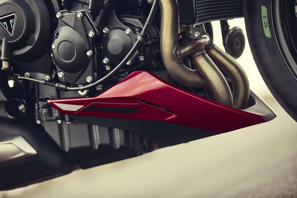 The 765 RS features a significantly updated, class-defining 765cc engine that incorporates learnings taken directly from the Moto2 race engine program, making it more performance-focused and characterful than ever. New pistons, con-rods, and gudgeon pins are matched to new, optimized combustion chambers for increased cylinder pressure limit and more power. New valves and camshafts give increased valve lift for improved intake, combustion, and exhaust efficiency, with new gearbox ratios for improved performance and responsiveness.