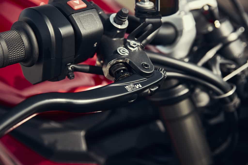 For racetrack-capable braking performance, the Street Triple RS comes fitted as standard with top-spec Brembo Stylema 4-piston radial monobloc front calipers with twin 310mm floating discs. A matching Brembo MCS span and ratio adjustable lever gives even more control and finesse, while a Brembo single-piston sliding caliper keeps things in check at the rear. Linked brakes provide the perfect balance of front-to-rear braking for improved stability and reduced stopping distances.