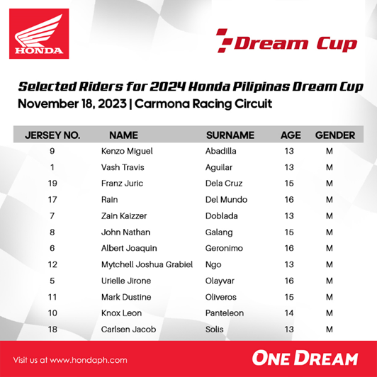 Honda Philippines, Inc. (HPI), the No.1 motorcycle manufacturer in the country recognized the talented racers to come out of the latest Honda Pilipinas Dream Cup (HPDC) tryouts. The event was held last November 18, are meant to help HPI discover and ultimately, nurture the next generation of motorcycle racing talents.