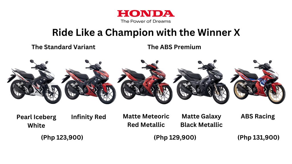 From camping, beach trips, to road trips, The New Winner X isn’t just about performance—it’s about style and ease of use. With its fully Digital Meter Panel, Smart Key System, and an All-LED Lighting System, it enhances visibility and convenience for every ride. Furthermore, the Anti-Theft Alarm and Answer Back System provide extra security, ensuring peace of mind wherever you go. Its sleek digital display, smart key system, and all-LED lighting enhance visibility and convenience, while an anti-theft alarm ensures security. Aside from its sharp lines and sculpted fairings that give the Winner X a sporty, race inspired look, its three distinct variants are designed to deliver a legendary ride. The Standard Variant (SRP Php123,900), available in Pearl Iceberg White and Infinity Red, features dynamic sporty decals that create a bold and energetic look. The ABS Premium (SRP Php129,900), offered in Matte Galaxy Black Metallic and Matte Meteoric Red Metallic, exudes a refined and premium aesthetic with its gold 3D Winner X emblem. Meanwhile, the ABS Racing variant (SRP Php131,900), which comes in Infinity Red, delivers an unmistakable sports bike image, further enhanced by a 3D emblem and gold cast wheel color for a truly standout presence.