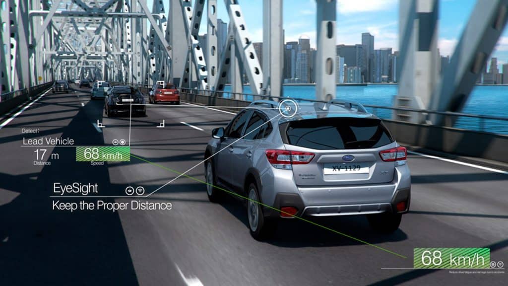 Aside from maintaining the speed as the traditional cruise control set by the driver. Adaptive Cruise Control adjusts the speed to keep a set distance from the lead vehicle by monitoring the distance and the difference of the speed. It adjusts the engine, transmission, and brake to keep your speed in line with the traffic flow. This means that EyeSight will tell the vehicle computer to speed up or slow down as the car in front accelerates or brakes.