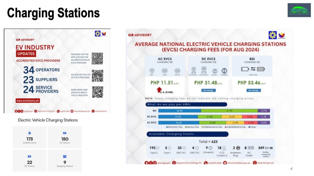 Charging is where things get murky. The presentation credited to the Department of Energy says there are 173 establishments with EV charging stations, 150 AC stations, 22 DC or Fast Charging stations, and 9 battery swapping stations. But in the same slide, they said there are 623 charging points nationwide that includes different protocols like Type 2, Type 1, GB/T AC, GB/T DC, CCS2 Combo 2 and a staggering 349 battery swapping stations.