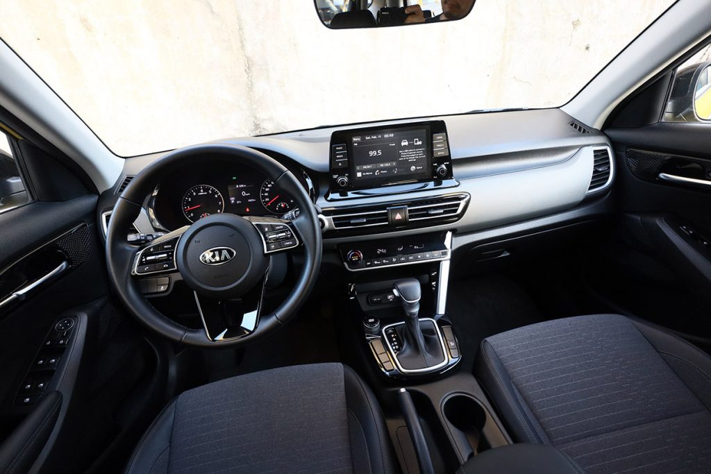 That futuristic, exaggerated vision of the future doesn’t quite extend to the Seltos’s interior, though. There are some playful elements like the center-tunnel-mounted grab handle and the geometric speaker cover, but overall, it reverts back to Corporate Kia down to some hard plastics on the dashboard and door panels. Nonetheless, at least its straightforward demeanor means it’s easy to understand. Ergonomically, it’s well-polished with the chunky three-spoke steering wheel, nicely bolstered seats, and controls positioned where you’d expect to find them.