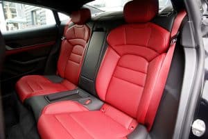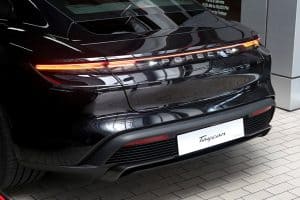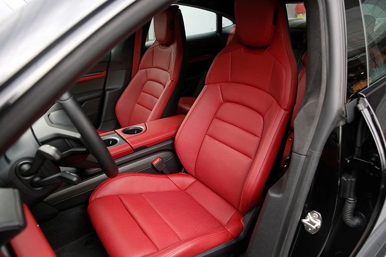 Sitting between the 911 and Panamera in terms of size, the Taycan Turbo S’ design is unmistakably Porsche. Up front, it looks wide and flat, with highly contoured fenders. The silhouette is shaped by the sporty roofline sloping downward to the rear. At each corner are 21-inch wheels with tires sized 265/35R21 at the front, and 305/30R21 at the back. Just behind them? Standard ceramic composite brakes. At the back, an active spoiler activates automatically depending on speed (there’s no override). Aside from the LED Matrix headlights, there are also other innovative elements, such as the glass-effect Porsche logo, which has been integrated into the light bar at the rear.