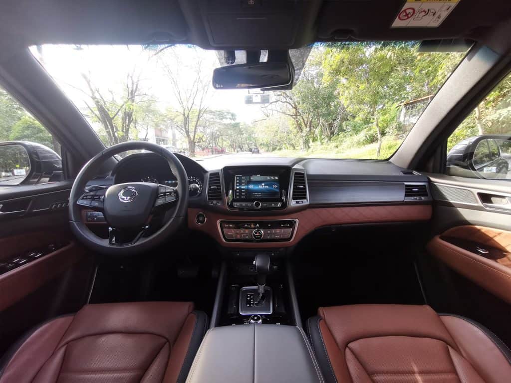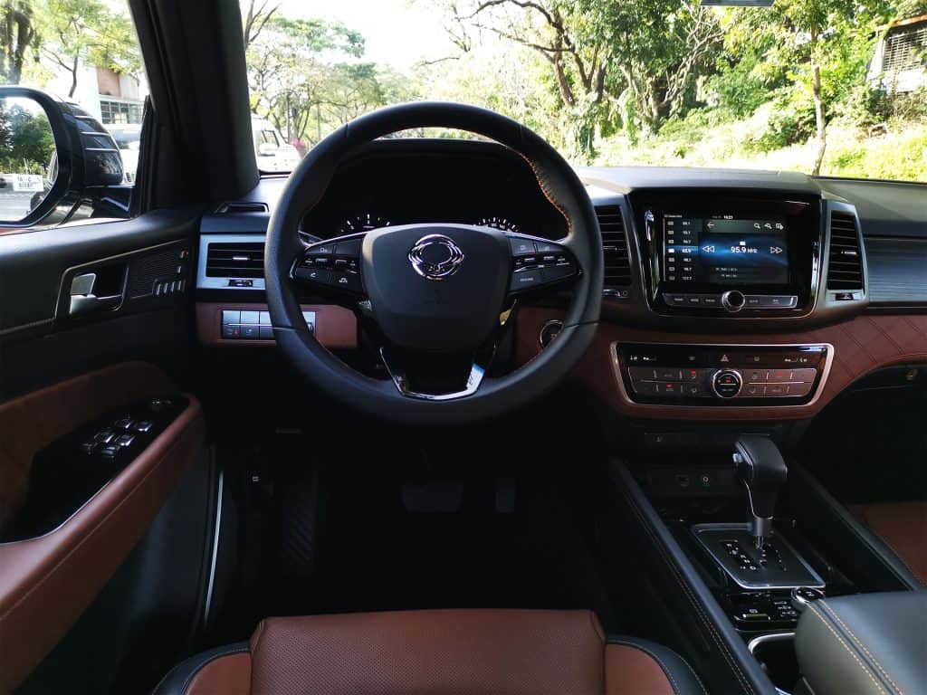 The Rexton will invite you as the driver’s seat slides back when you open the door, just like in luxury cars. Close it and the seat will return to the last setting it was in. Upholstery was done in a two-tone fashion, a mixture of black and brown, with perforations on the front seats to allow for the cooling and heating functions. There’s leather with a diamond stitch pattern on the door panels and the on dashboard, which also has an additional wood accent.