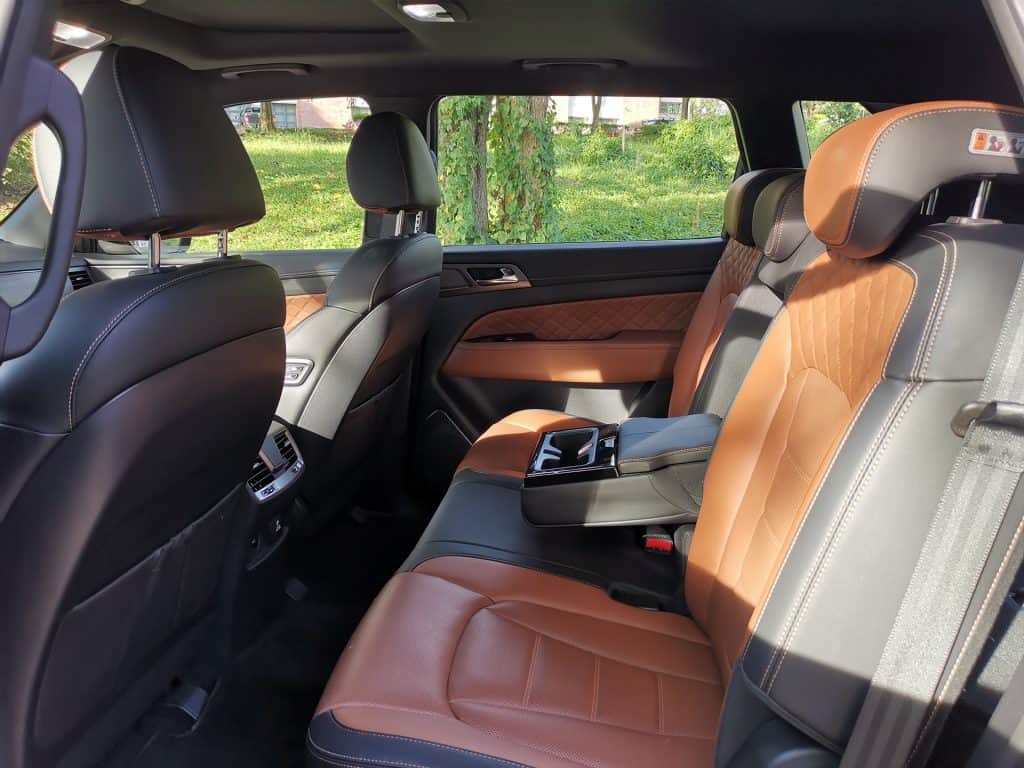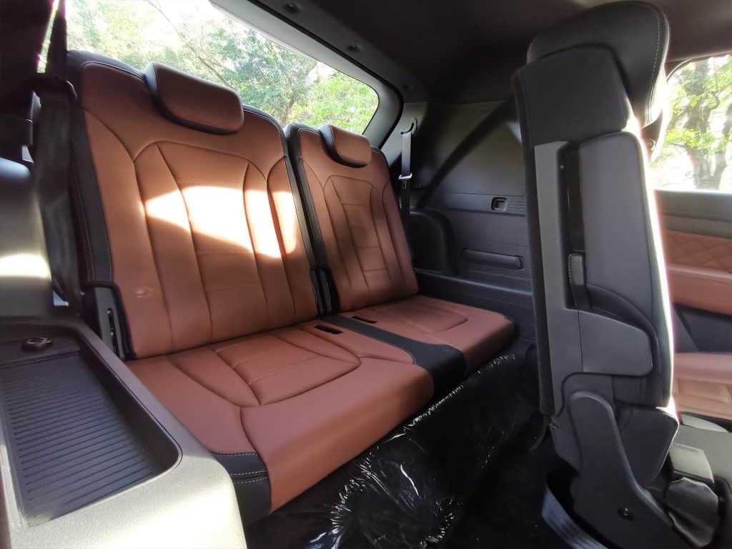 It continues at the second row, having an upmarket center armrest with piano black trim, air vents, a 220v socket, and a USB charging port. They missed their mark for the third row though because even though it has enough room for two adults, the air vents are only on the right side, clustered with the air control. The positioning also makes these vents easy to block, decreasing air flow for the other third-row passenger.