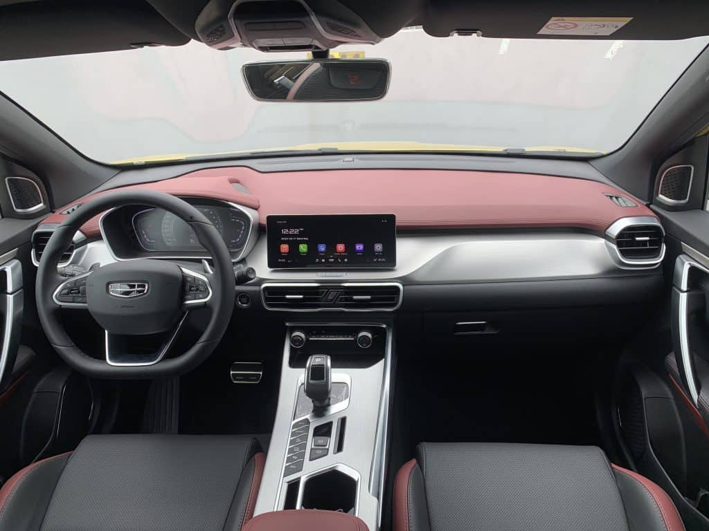 The interior, though, is where it’s at. The cabin of the Geely Coolray is all about refinement and simplicity, which can be seen in the red-and-black motif, complemented by matte chrome detail. This two-tone combination extends to not only the dashboard, but it follows through along the inner door panel, the bucket seats in the front row and rear bench, and all the way down to the center console. One of my favorite details is the ultra-discrete door handle that seems to melt right into the panel and the sporty, race-inspired feel of the flat-bottomed steering wheel.