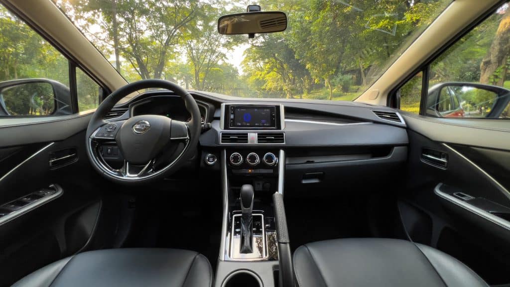 The cabin is more or less a twin wearing different clothes. The seats, space, rear aircon vents, the cargo space, and dashboard amenities of the Livina are clones from its mechanical twin. The kicker is they’re from the previous iteration of the Xpander, given away by the arches on the dashboard. What’s new here are the dark wood veneers on the dash and door panels. Leather also hug the seats which is a nice touch that complements the more classy appeal of the exterior.