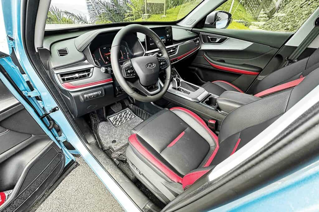 The addition of red accents on the front and side, along with chrome and silver trims at the rear, adds a touch of sportiness to the overall finish. Power-folding side mirrors with turn signals, a rear spoiler with high-mounted brake light, roof rails, and 18-inch two-tone alloy wheels complete the exterior package, giving the Tiggo 5X Pro Hybrid a striking and modern appeal.