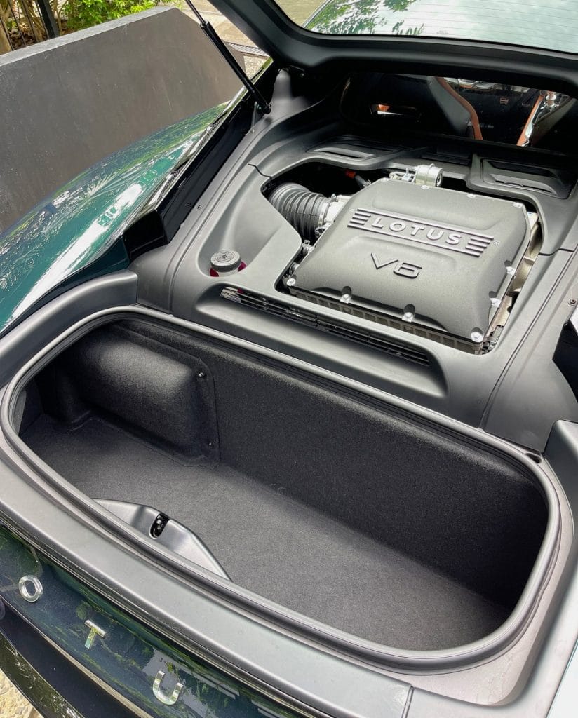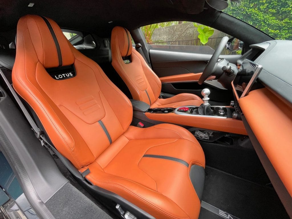 Some key highlights that have transformed the interior to the very best Lotus has produced are the Volvo-sourced switchgear, the 560-watt 7-speaker 10-channel KEF premium sound system that features its signature Uni-QTM technology that supports the 10.25-inch infotainment system with standard Apple CarPlay and Android Auto smartphone connectivity, rear camera and parking sonar on both ends, 12.3-inch TFT instrument cluster, unique flat-bottomed squared-off sports steering wheel with metallic spoke detail and integrated controls, functional cup holders and extra door panel storage, a proper glovebox and center armrest with storage, and 208-liters of cargo space behind the seats and another 151-liters in a storage bay behind the engine. If you look carefully at the rear window, you will notice a gap between the end of the glass and above the rear trunk for extra engine cooling.