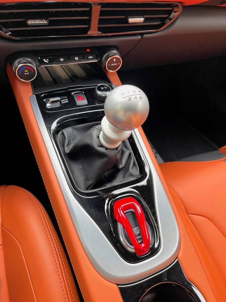 Embodying all the best of its modern predecessors; the Elise, the Exige, and the Evora (where it sources once again the mighty and extremely reliable Toyota 3.5-liter V6 powerplant with intercooled Edelbrock EATON 1740 supercharger), the Emira instantly reminds the driver how special it is before even sitting behind the steering wheel and flipping the dramatic red cover open to reveal the ignition. The manual 6-speed gearshift mechanism and throttle actuator in the V6 (400 bhp @ 6800 rpm / 317 lb-ft @ 3500 rpm) engine bay are both exposed and celebrated.