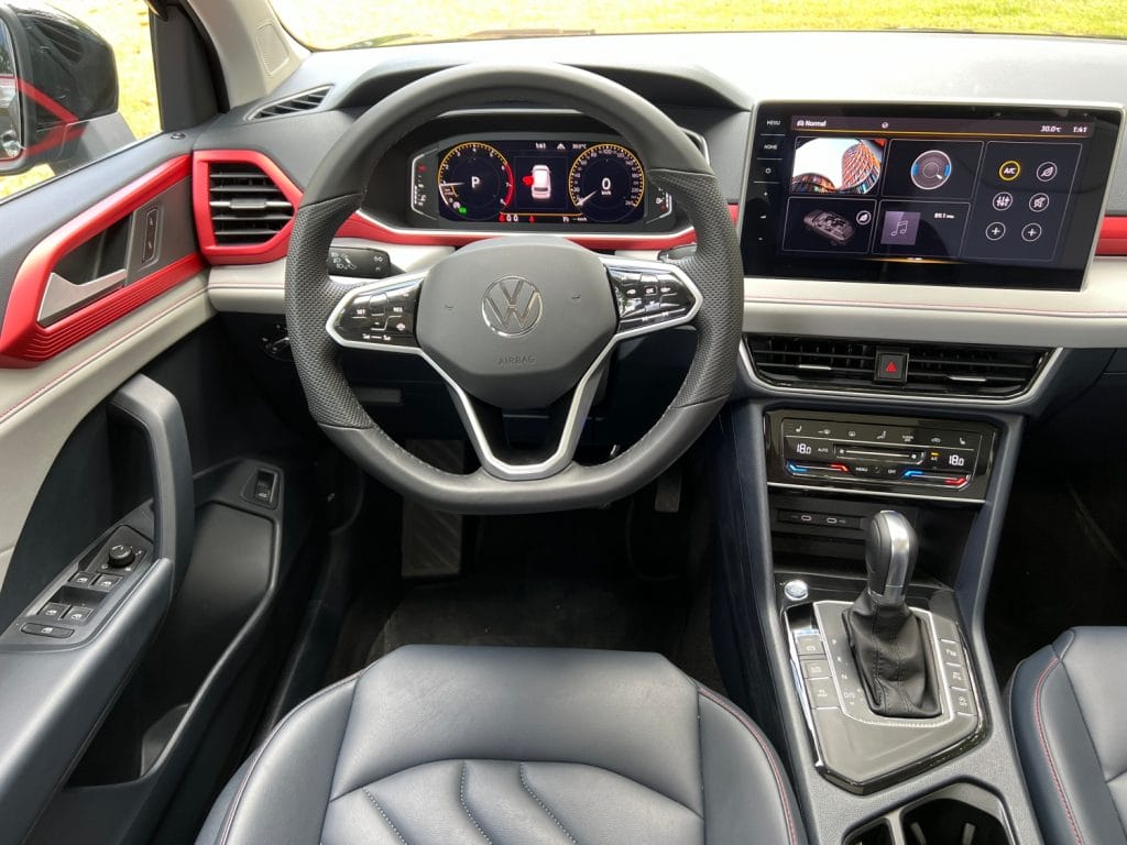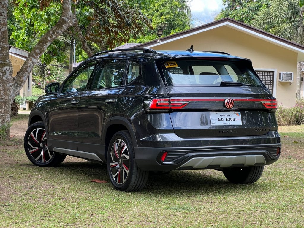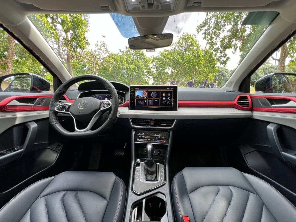 At first glance, it’s easy to see the silhouette of the smaller T-Cross. The Tharu took that one notch higher with its small revisions like the black fog light housing, simplified skid plate, lightbar on the grille, light bar at the tailgate, lighted VW logo, and this SEL has a red accent on the wheel covers.