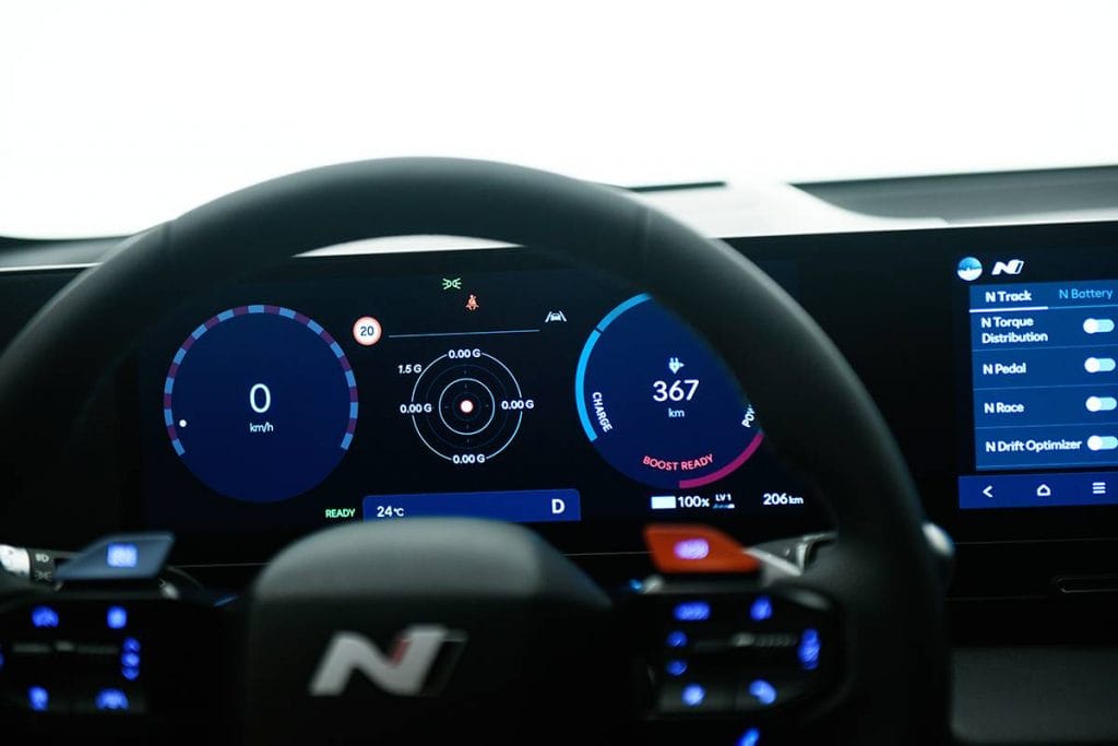 The steering wheel itself has two N buttons, and they don’t do the same thing. The left is to open a pre-configured custom mode, while the other activates e-shifting. Now, feeling shifts in an EV is anything but orthodox (you even get a rev counter), but it’s important in getting that bit of additional feedback on the racetrack. The same goes for the separately switchable active sound generator. Typically, these things are there just for gimmicks, but it’s executed quite beautifully here. Surprisingly, the fake engine sound’s even pumped outside thanks to the two exterior speakers. “Ignition” is the typical default, but in keeping with the EV theme, “Evolution” is a personal favorite.