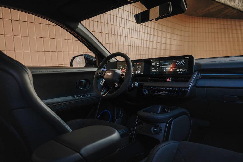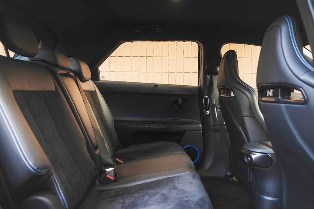 Inside, there isn’t a big difference between the Ioniq 5 N and the regular Ioniq 5, although it’s obvious that the slidable “Universal Island” is now fixed, acting as a knee pad for those seated upfront. There’s also much more visual drama here thanks to the all-black suede and leather combo as well as the spattering of Hyundai N branding, including on the steering wheel for the first time. The front seats aren’t electronically adjustable, but at least retain their heated and cooled functions. They’re mighty comfortable and supportive.