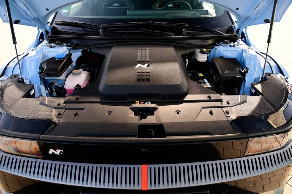The E-GMP platform has been welded and glued to be stronger, the suspension subframes have been reinforced, and the suspension tweaked with wider tracks and arms. Then you have adaptive dampers and 21-inch forged alloy wheels at each corner (they weigh the same as the standard Ioniq 5’s 19-inch set). The steering column mounts have also been strengthened and given a quicker ratio. The rear motor now has an electronically controlled limited slip differential and the front brakes fitted with four-piston calipers. And that’s just the start.