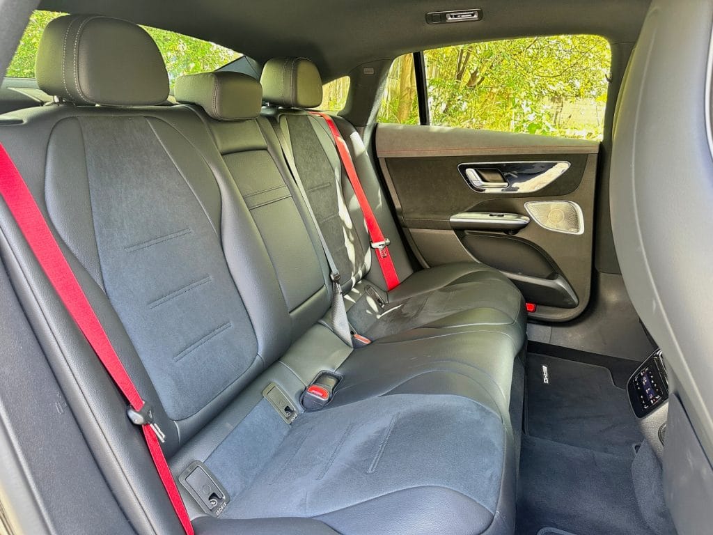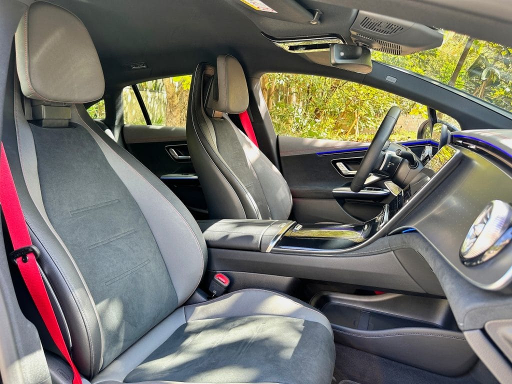 The EQE is not instantly desirable to look at as its aesthetics are more functional than flamboyant. Thankfully the cool-looking mixed alloy wheels make up for the very aerodynamic beluga whale exterior design. The capacious interior is a great place to be and I do like the contrasting red seat belts but not the excessive ringless three-point stars on the dashboard. The massive dashboard would look and feel much better with the more organic wood trim which would also make the turbine air vents look even better along with the 12.3-inch digital instrument cluster and 12.8-inch central touchscreen display.