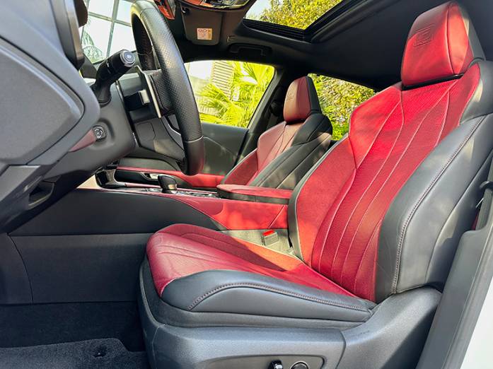 The Lexus RX 500h F Sport interior is wonderfully finished with a plethora of unique materials and surfaces combined with high technology. Highlight features include the 1800-watt 21-speaker Mark Levinson audio, the massive 14-inch infotainment control screen, the 10-inch HUD, enhanced connectivity, and the wireless phone charger. Lexus also features their own unique synthetic engine noise pumped into the cabin under throttle to disguise the electrified character, at varying levels depending on the drive mode selected and the level of throttle input.