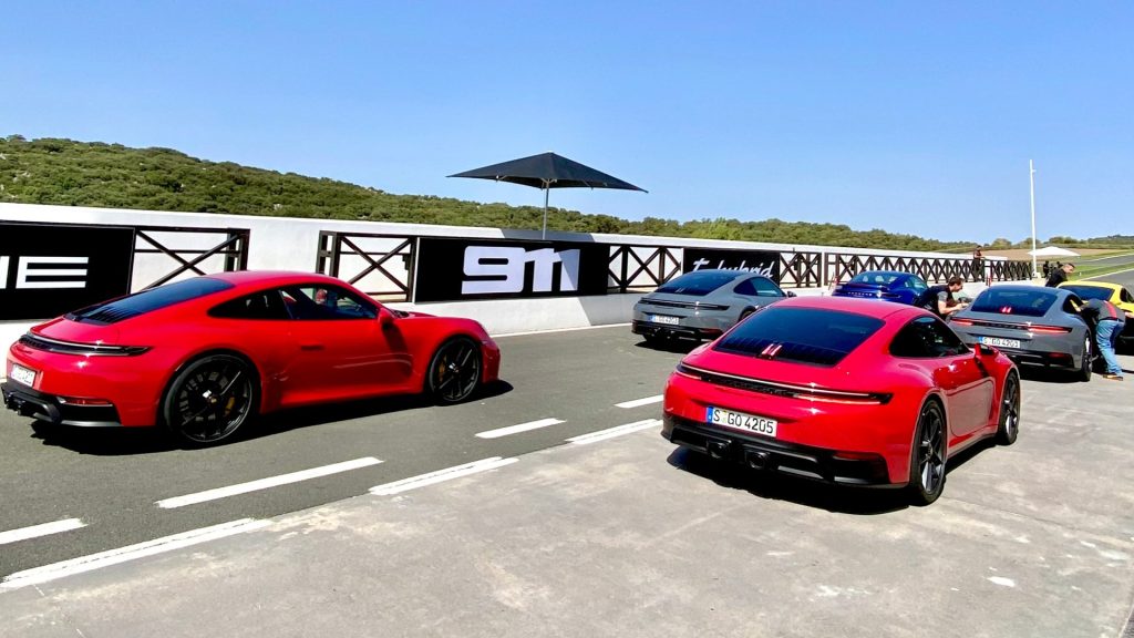 The three media cars were a 911 GTS Carrera 2, a 911 GTS Carrera 4, and a non-hybrid base 911 Carrera. We were jumping from car to car and didn’t have time to check out which car we were in (they all look alike at first glance). My first two cars turned out to be the hybrids, which proved to be easily capable of keeping up with the flying 911 Turbo of our instructor (kids, don’t try this at home).