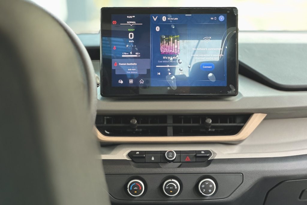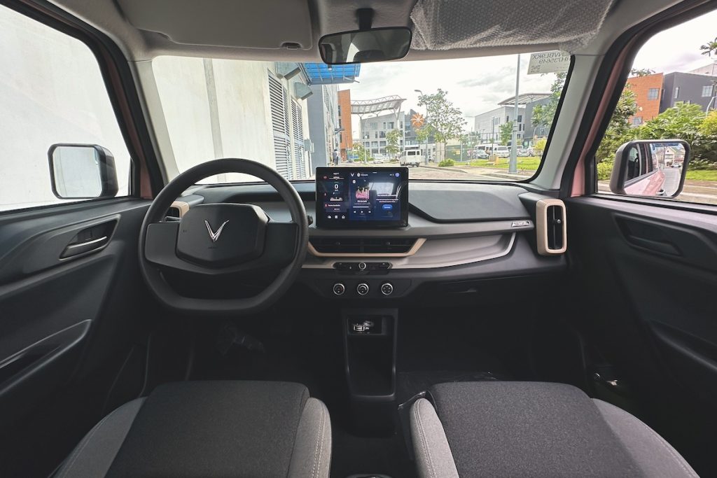 Up front, the cabin is surprisingly roomy. The VF 3 is designed to comfortably seat four, and with no bulky center console or excess controls cluttering things up, the driver and passenger enjoy plenty of space. At the center of the dash, there’s a 10-inch infotainment screen, which also houses most of the car’s controls. It’s pretty minimalistic, but that’s part of the appeal. You still get physical knobs for the air conditioning, which I personally love—it’s much easier and safer to use while driving.