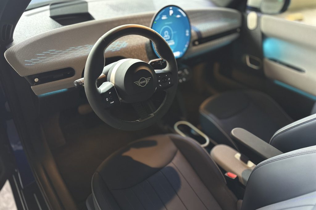Stepping inside, you’ll find a blend of classic Mini charm with contemporary, almost futuristic design elements. The minimalist layout looks like it’s fresh out of a concept car, with clever textures and sustainable materials that make it feel high-end and eco-conscious. Ambient lighting shines through the unique textures and adds a vibe to match the mood you’re in, especially with the cool monogrammed dash. It’s all very Mini, just kicked up a notch.